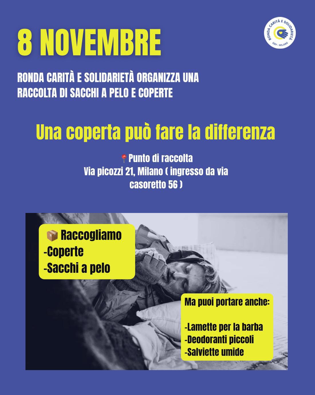 La raccolta straordinaria si svolgerà venerdì 8 novembre dalle 10:00 alle 13:00, presso la sede del Centro Diurno di Ronda (via Picozzi 21 a Milano), vi aspetteremo per accogliere le vostre donazioni.