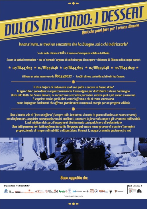 Si tratta di una serata in cui si organizza una cena in piazza cui sono invitati cittadini e senza dimora, cui segue, per chi lo desidera, una notte all’aperto nello stesso luogo, dormendo come fanno coloro che perdono l’abitazione.
